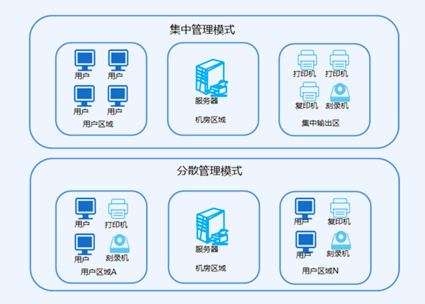 集中部署模式是指将用户单位所需的输出设备统一部署在输出区,统一为网内各个部门提供打印刻录服务,此模式优点是设备统一部署,维护方便,不需要各个部门自行建设维护,缺点是输出区故障后,所有节点无法独立输出。